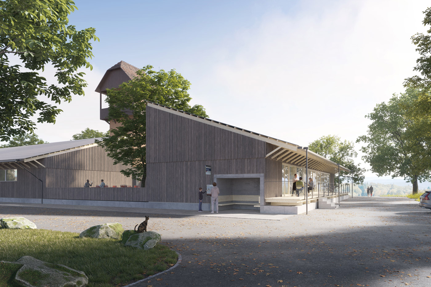 2025 – Baden, Waldgasthof Baldegg – Planerwahlverfahren für die Erweiterung der bestehenden Kücheninfrastruktur und den Einbau eines Saales in die bestehenden Scheunen. An Stelle einer Sanierungslösung werden zwei Ersatzneubauten für die beiden Gebäudebereiche vorgeschlagen. Gastroplanung GaPlan GmbH, Würenlingen, Visualisierung: OVI Images, Baden.